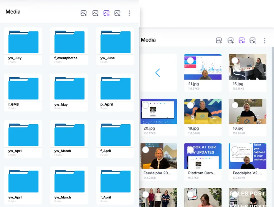 Store your files directly in Feedalpha and free up space on your computer, while keeping all your images, videos, and graphics organised and ready to post in one place.