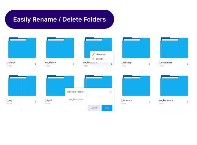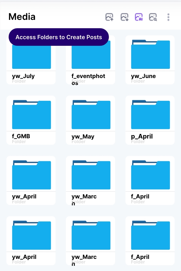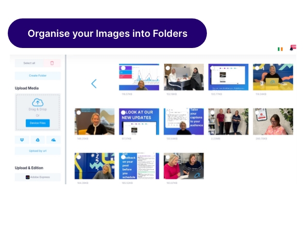 Create folders to neatly organise your posts, easily rename or delete folders, and have everything ready whenever you need it. Upload media directly from your computer or import from cloud services.